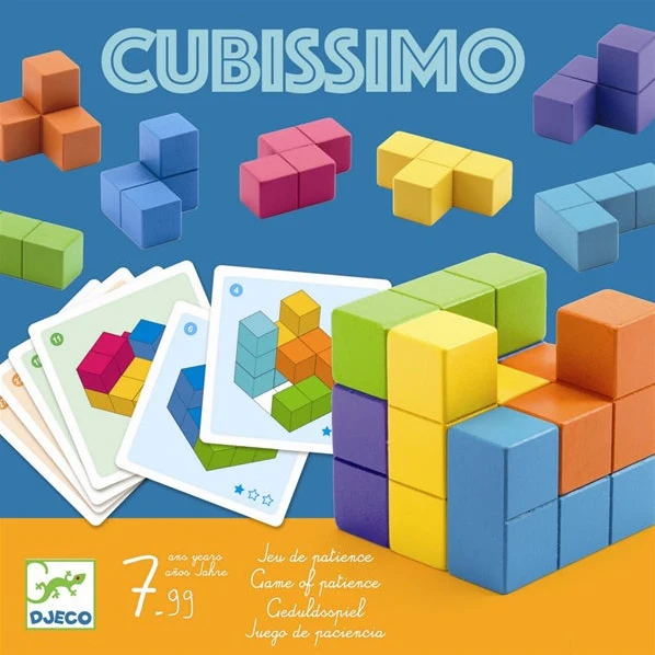 لعبة تفكير، تتكون من ٧ قطع مكعبات خشبية، لبناء مكعب مثالي. ٣٠ بطاقة مليئة بالتحديات، تُظهر نقطة البداية لبناء مكعب مثالي. الحلول مرفقة. مناسبة للأعمار من ٧ سنوات فما فوق.