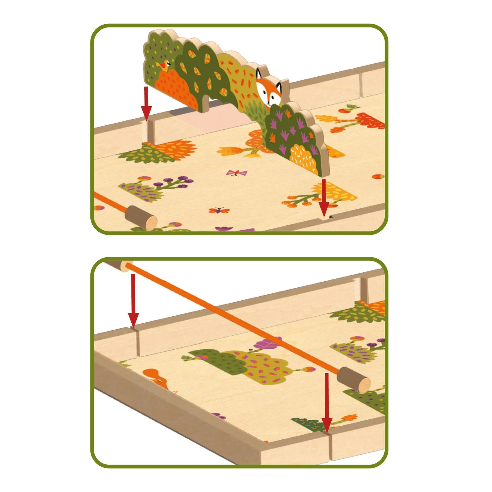 ولعبة التصويب. على أحد الوجهين، يُحرك الأطفال أقراصهم عبر حاجز "الشجيرات" للوصول إلى الوجه الآخر، وعلى الوجه الآخر يُصوّبون