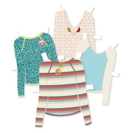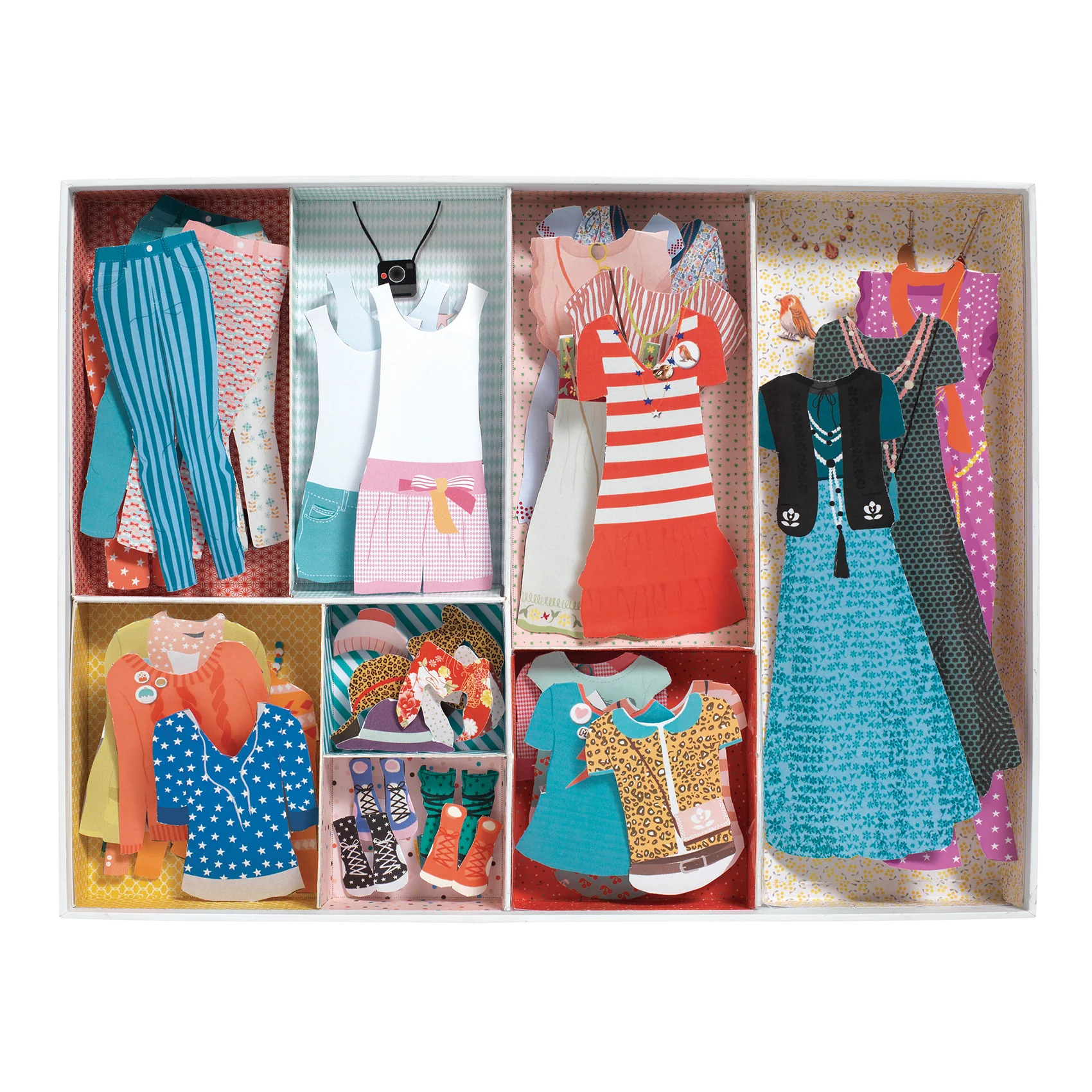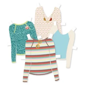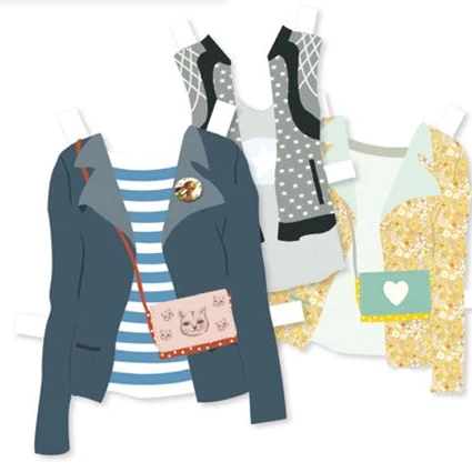 صندوق كبير يحتوي على تشكيلة واسعة من الفساتين والمعاطف والسراويل والأحذية والقمصان وغيرها. ثلاث شخصيات مصنوعة من الكرتون المقوى، يمكن تغيير ملابسها مرارًا وتكرارًا. مناسب للأعمار من 7 سنوات فما فوق.